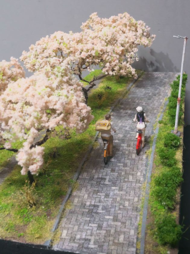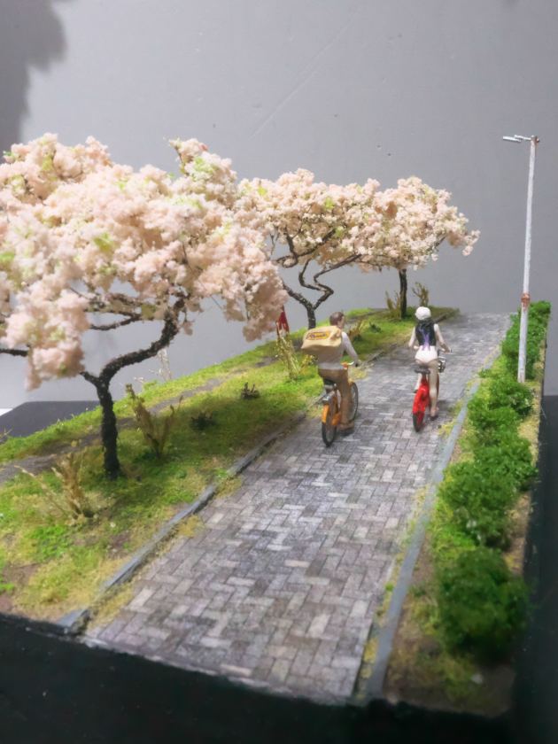 実はこの情景のスケールは1/64、ジオラマサイズは25cm×20cm、大きく見えるかも知りませんが、2台の自転車がこの1円玉の上にのります。自転車のスポーク