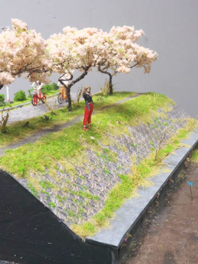 3Dプリンターによって造形された1/64スケールのフィギュアを使って、ご近所の河原の風景をジオラマにします。
