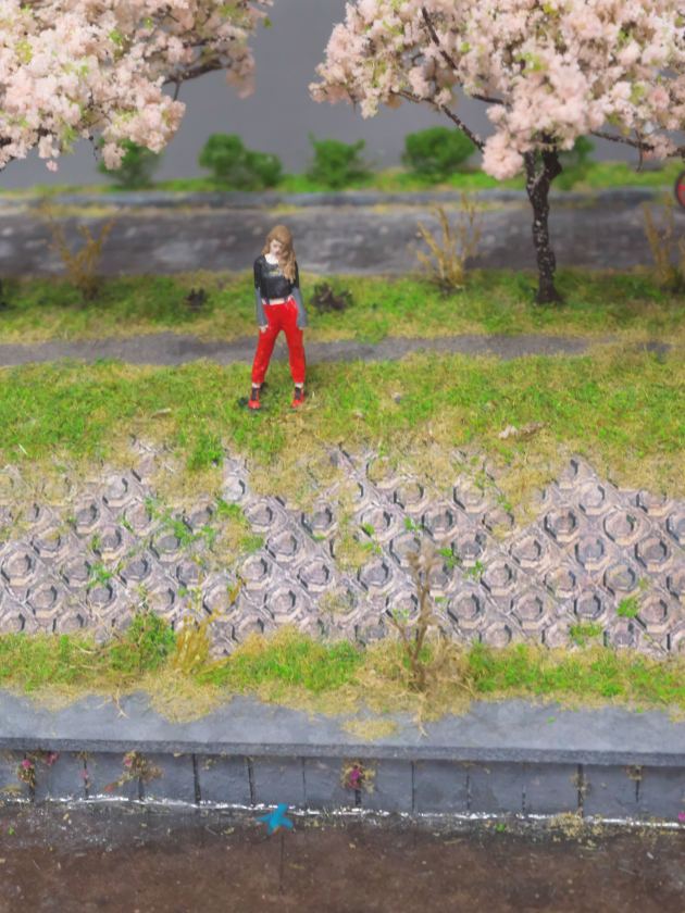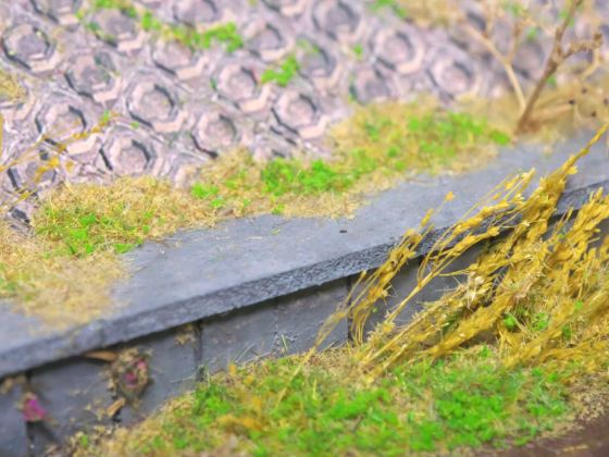 歩道周辺は花壇として手入れされているので、枯草表現は控えめです。配合はターフとファイバーが 2:1 といったところです。(A)
