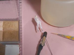 まずはピンバイスで穴を開けて、0.5mm径のステンレス線をフィギュアに取り付け、サーフェーサーを吹き付けます。