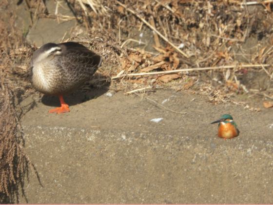 思川桜とならぶここの名物はカワセミ君です。多い時には200mの間に3羽ぐらいいたりする。この日もお昼寝中のカモさんの横で狩りをしてました。