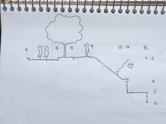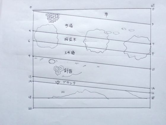 川、斜面、土手、桜、歩道がただただ平行に並ぶだけでは変化がなさすぎなので、いちばん右の画像にあるように、歩道を緩やかにカーブさせることにしました。