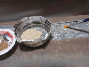 あとは隅っこの部分にところどころ水で薄めた木工ボンドを塗って、砂や茶色のパウダーを撒いて、土や葉っぱの汚れを表現します。