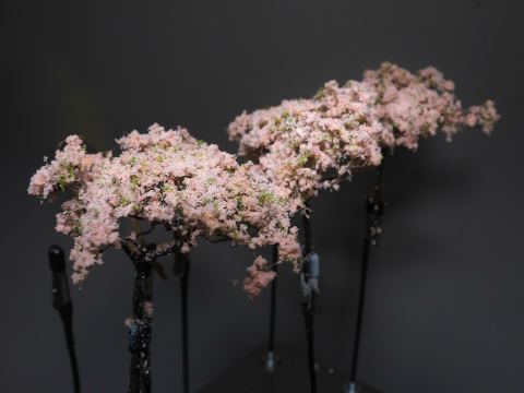 ポイントとしては「紅白の梅」→「オランダドライフラワー」→「桜の花」→「桜パウダー」という順で、少しずつ粒子を細かくしてゆくことです。こうすることでふんわりとリアルな桜の木が