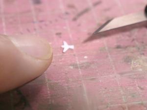カワセミの体長や翼長を1/64に換算すると、それぞれ3mm及び4mmとなる。プラ板をこのサイズにカットしてから、上面形を切り出した。