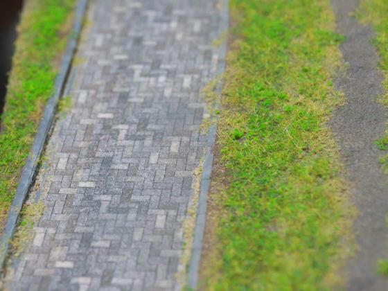 プリンターでつくった歩道には、チャコールグレーでところどころにシミのような汚れを加え、全体に艶消し剤を多めに添加したタンをうっすらと吹き付けて、埃汚れを表現します。