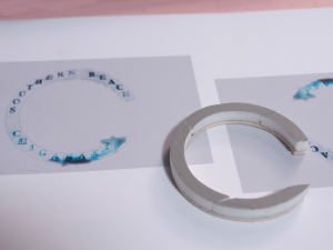 薄い合板にサークルカッターを入れて、まずはドーナッツ状に切り出します。そしてその上にスチレンボードを乗せて切り出し、厚みをつけます。