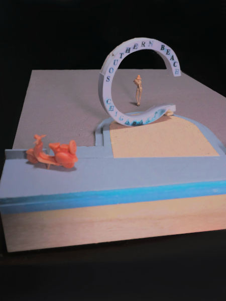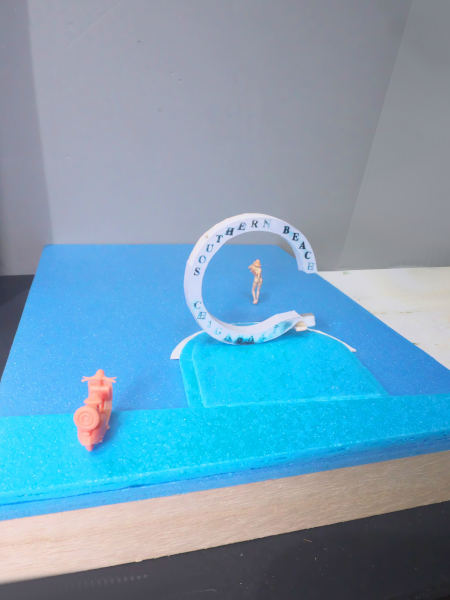今回のモデルになったのは、言わずと知れたサザンビーチ、3つ目のアイテムとしてこのモニュメントをこれからつくる予定です。遠方に小さく見えるのは烏帽子岩、でもさすがに