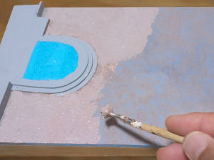砂浜を表現するのに使った下地塗料を水で薄め、ステージ部分の溝や影になる部分に少量塗って、これが乾く前に「浴びっこサンド」撒きます。