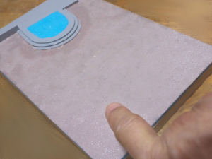 階段を中心にして、全体がなだらかなスロープになっているので、これを粘土で表現します。但し粘土はそのままではスチレンペーパーに馴染まないので、粘土を盛る場所には