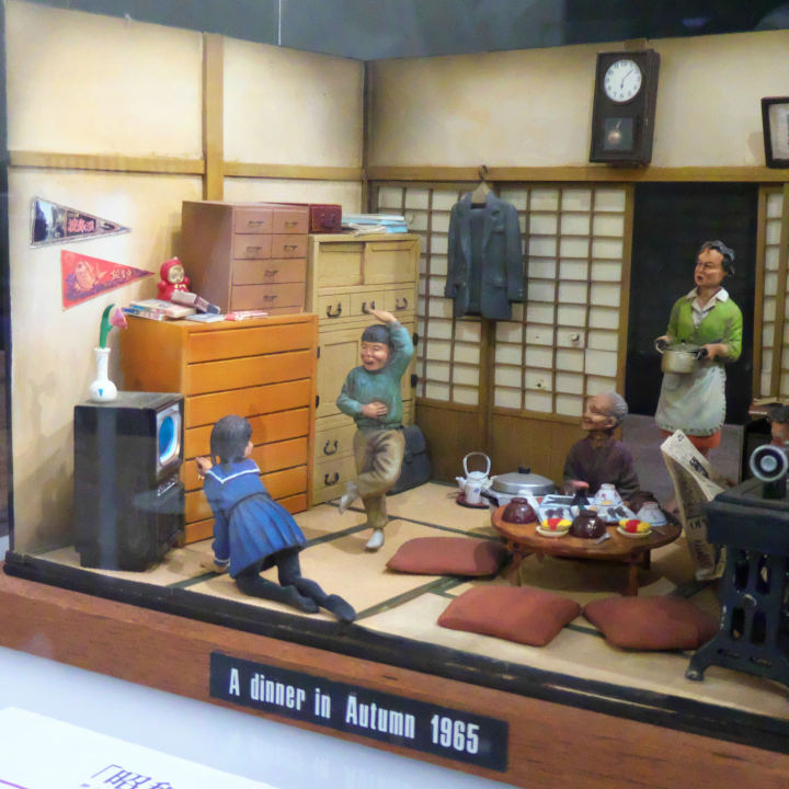 親子三世代が食卓を囲む、そしてその中心にはテレビがあった。これが昭和の家庭の風景の代表的なものの一つでした。少年のポーズは「シェー」というもので、
