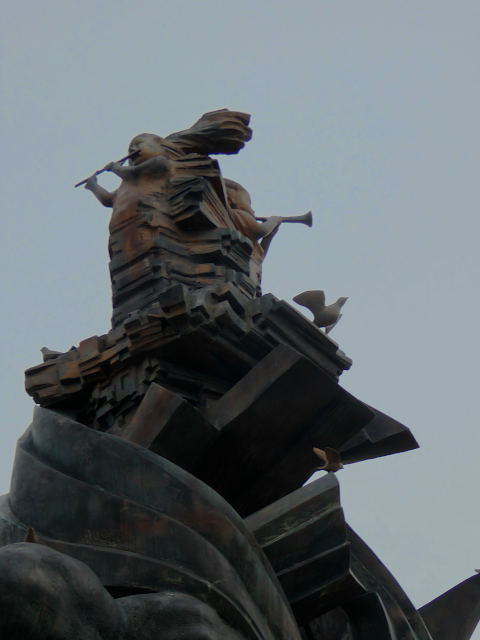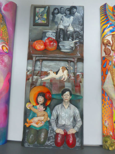 下の立体彫刻の一つをアップにするとこんな感じです。高さは4mほどもあって、2016年に岡本太郎賞の大賞を受賞した巨大壁画だそうです。