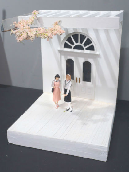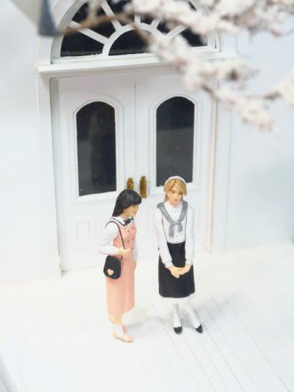 こちらは「地雷系 量産型」女子2名が、白いお屋敷でお花見をしているというシンプルなジオラマです。桜の季節が近いということで展示しました。(1/24スケール)