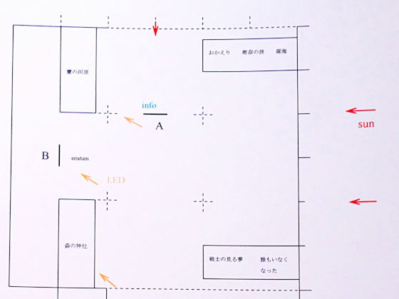 上の画像がその配置図の一部(上面図、18畳の正方形)ですが、太陽光線の向きを赤い矢印で示しています。光はほぼ右側から入ってくる。左半分に大きめの作品を