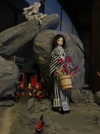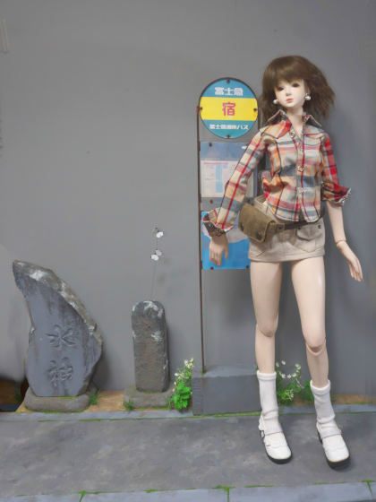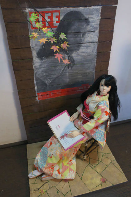 こちらは角材とイグサマットでベースを作り、他のドールスタンドを移植したもの。背景の暖簾はガシャポンの景品です。