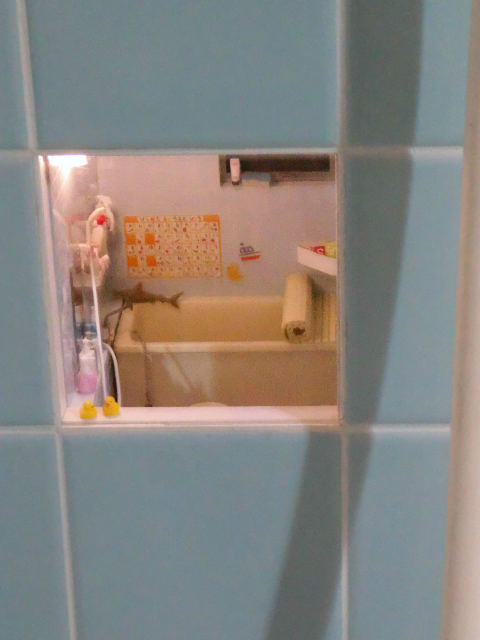 一見してはふつうのバスルームなんだけど、タイル一枚分がこびとのスペースになっていて、そこに小さなバスルームがある。