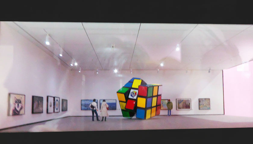 1/48ぐらいに縮小してつくった美術館内に、リアルなルービックキューブを置いた作品です。珍しくフィギュアが置かれていますが、これはフィギュアがないと美術館に