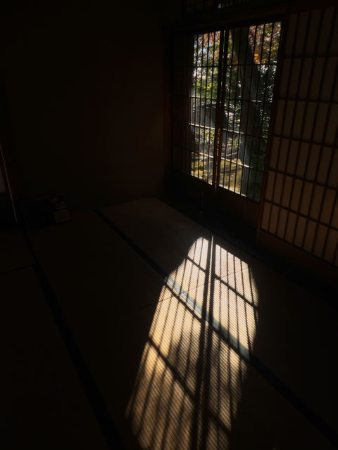 訪れるなら絶対に朝が良い。格子からのぞく紅葉と差し込む光の関係が絶妙です。
