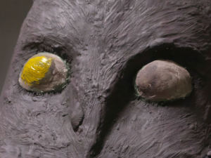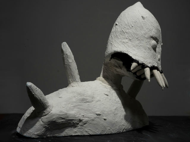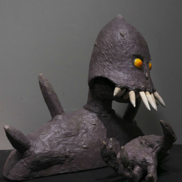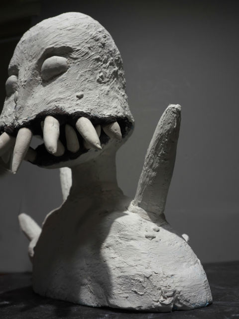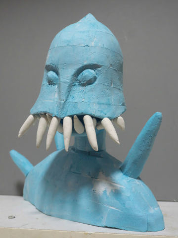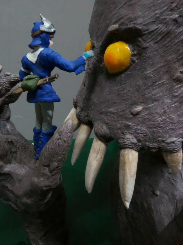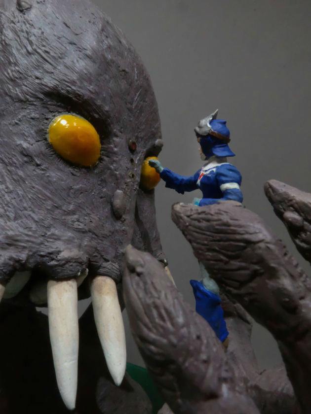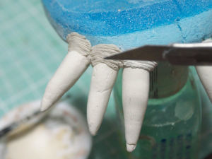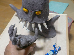 、爪楊枝に人形造形用の粘土ラドールプレミックスを盛り付けて牙を作りました。そして牙を本体に差し込んで固定します。やっと巨神兵らしくなってきました。