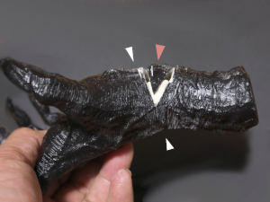 イメージしているシーンでは、手首が手のひら側に曲がっていると都合が悪いので、いったん切断して手の甲側に曲げ直す。実際には中写真のように白いマーカー