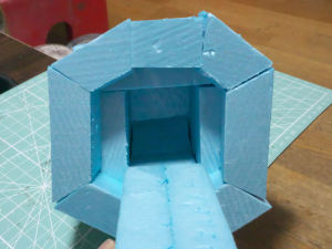 本体そのものは、入手しやすい2cm厚のスタイロフォームを適当な大きさに切って積み重ねる形で整形してゆきます。なかは空洞です。資源の無駄はもったいないので。