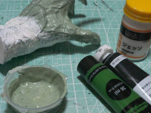 巨神兵と天板の接合部分が透けて見えるのはよろしくないので、彩度を下げた青緑のアクリル絵の具を、希釈液に溶いて塗ります。(D 希釈したので画像は白っぽい