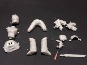 基本的には、ほぼすべてのパーツを関節部分で切断し、エポキシパテでつなぎ合わせる。できた段差などはタミヤパテを薄め液で伸ばしながら埋めてゆきます。