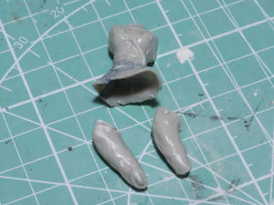 そして切断面付近にジェッソを塗り、隙間や段差のある部分に造形用粘土を盛ります。そして爪楊枝で失われたモールドを修復します。