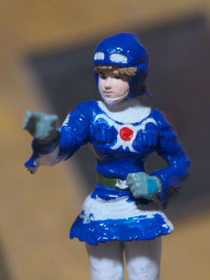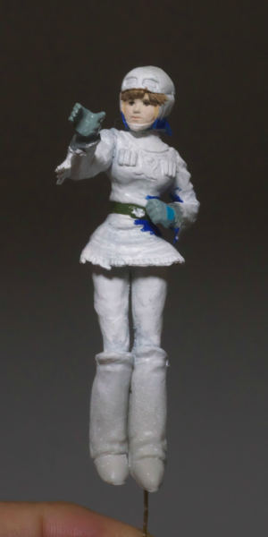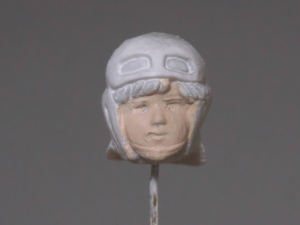 あとはめがね式のルーペを用いながら眉や瞳を描いてゆく。そして最後にMrカラーのGX113つや消しクリアーを吹き付けて定着させます。(右画像)