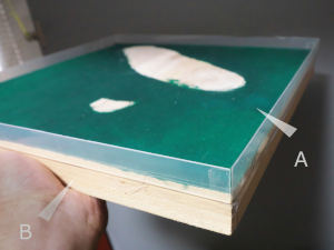 つなぎ、更に木枠にPPテープで上から押さえます。(B)