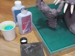 粘土を盛って薄くのばし、漫画を参考にして質感を出しながら仕上げてゆきます。使う道具は60°カッター(へらの代わり)と固めの筆(掃くようにこすると、筆跡がシワに見える)です。