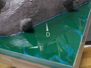 このとき巨神兵の周辺は、巨神兵自体の作る影によって水は更に暗くなるはず。だから巨神兵周辺は更に一段明度を下げて塗りました。(A)