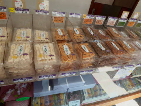 こちらは「津久井せんべい本舗」です。ものすごい種類のおせんべいが置いてあって試食も可能、一番人気は「ブランデーせんべい」で、信じられないほど